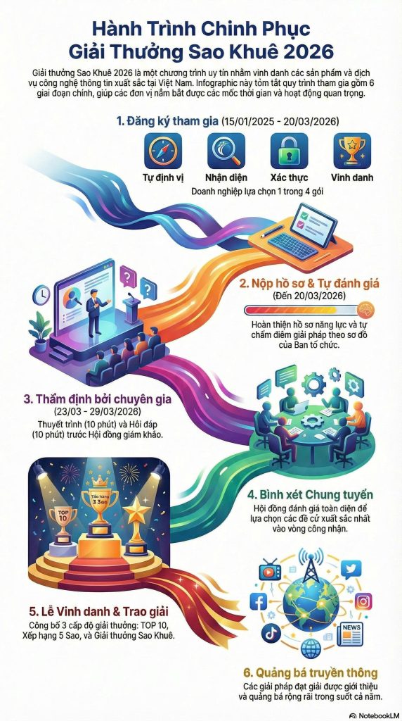 Lễ trao Giải thưởng Sao Khuê và công bố Bản đồ Giải pháp Công nghệ số 2026 được tổ chức trang trọng tại Hà Nội và phát trực tuyến. Các giải pháp đạt Giải thưởng nhận Cúp, Chứng nhận và ghi danh chính thức trên Bản đồ năng lực.